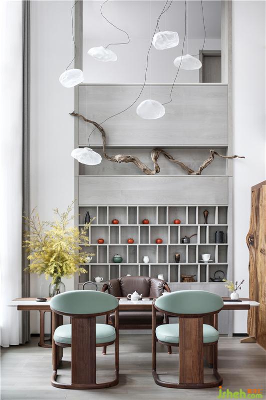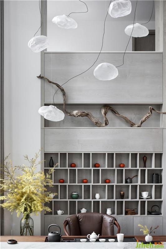 挑高的茶室,依勢設(shè)景,置入設(shè)計師個人收藏多年的崖柏,蒼勁飄逸,鬼斧神工,與整個空間渾然天成。云朵造型的Bocci吊燈,溢出枝椏,輕盈空靈,仿若置身云端。