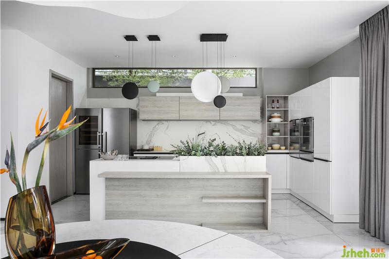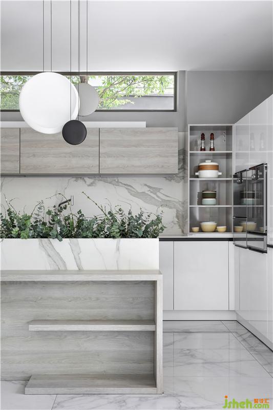 西廚、餐廳合中有開,造型別致的Vibia吊燈和Catellani & Smith吊燈為空間增添了些許藝術(shù)氣氛,開放式的西廚與餐廳增加了家人間的親密互動,便于情感的交流與溝通,“合”亦是為了更好的“開”。