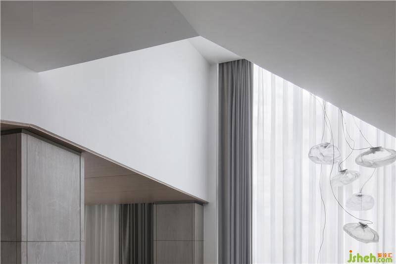 在本項目的空間中,直角折線將冷暖融會平衡,譜寫出和諧的旋律,使空間形成內(nèi)在統(tǒng)一的渾融秩序。鈍角折線則試圖沖破發(fā)出強音,卻終因內(nèi)質(zhì)的柔和而趨于悠揚,打破空間和諧秩序的同時,讓空間變得富于潤度。當今時代“擬物”審美的催生、極簡風的盛行都離不開人們重新審視自然的眼光。返璞歸真、回到物本身……都不僅僅再是一個口號,而是空間迫切需要灌注的養(yǎng)分??臻g本身就有著自己的呼吸開闔,一呼一吸,無拘無束,自然而然。 理性嚴謹?shù)目蛻粝矚g天然的木質(zhì)材質(zhì),沒有現(xiàn)代的奢華感,充滿溫暖。設(shè)計師因此在空間中運用了大量的原木元素:木質(zhì)屏風、沙發(fā)底座、臺燈底座、木質(zhì)樓梯、木質(zhì)版畫、木質(zhì)方幾……無不流露出濃郁的自然雅韻。