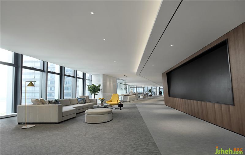 從入口踏入內(nèi)部,便是豁然開朗的接待空間。不同顏色的地毯將分割地面并組合作為豎向交通引導(dǎo),將空間規(guī)劃因勢利導(dǎo),平面流線順理成章地向前延伸,整體規(guī)劃路線一目了然。