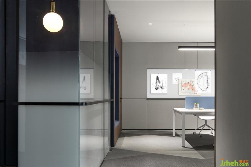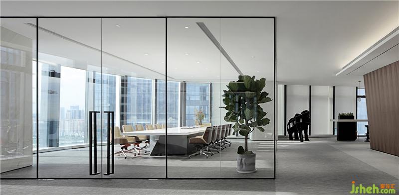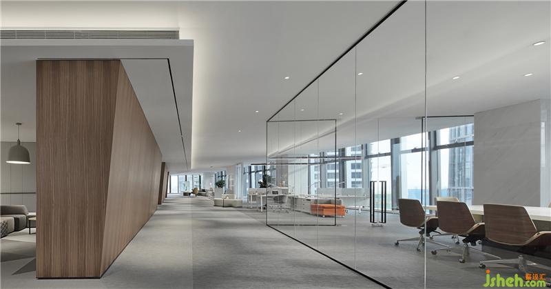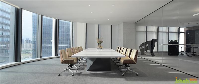 大面積玻璃代替厚重墻體,輕薄的線條邊框隱匿其中,共享會議室的物理分區(qū)體量被減至最小?!巴该骱凶印钡慕Y(jié)構(gòu)被光線打通,一個高端質(zhì)感迭代空間內(nèi),空間與工作發(fā)生緊密而富有無盡創(chuàng)造力的未來。裝修設(shè)計
