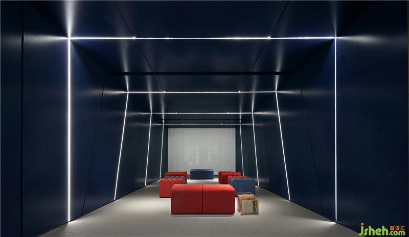多功能影音廳身兼員工培訓(xùn)、公司文化展示、休閑影音播放等多種文化社交功能,以“盒子”的概念集成出一個幽暗與明亮對比的焦點場所。包裹墻面和天花的沖孔鋁板有效吸音,實現(xiàn)完美的聲學(xué)效果,為表情豐富多變的工作方式形成可能。