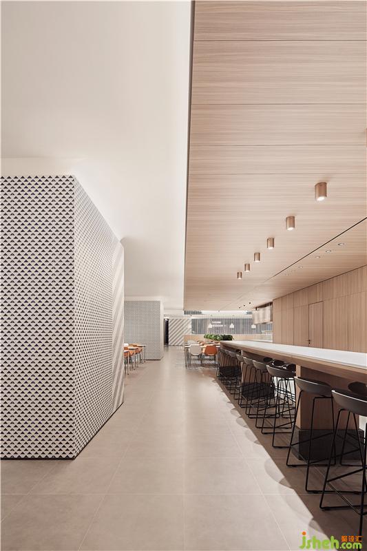 平面構(gòu)成的元素弱化了原有柱網(wǎng)的體量,在空間中形成了隔而不透的裝飾墻的效果。序列感的線條與活潑的基調(diào)并沒有自亂陣腳,反而萌發(fā)出微妙的契合。餐廳設(shè)計