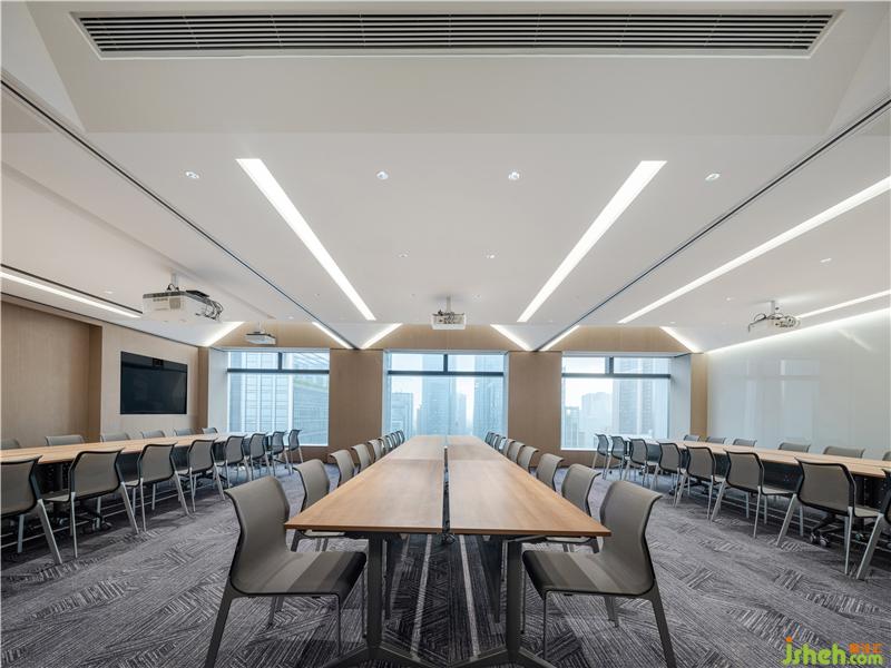 空間內零星分散了小型會議、組合會議、視頻會議等不同等級的會議室及會議系統(tǒng)。會議室內的燈具都做了防眩光處理,風口做了散流口的處理,提升舒適感的同時減少了會議打擾。