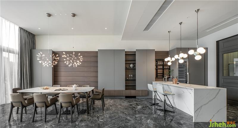 大面積開闊的空間將餐廳、吧臺(tái)置入,高低錯(cuò)落,有條不紊,為其增添足夠的互動(dòng)性。