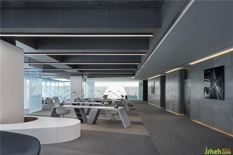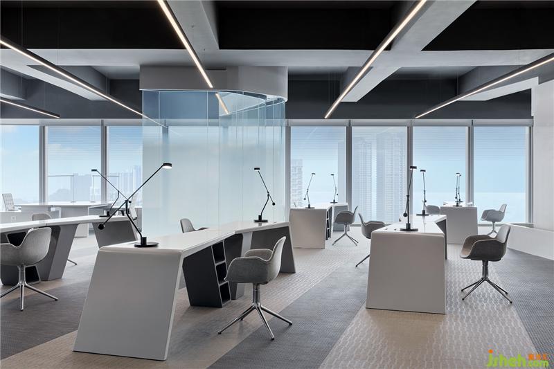 傳統(tǒng)的巨大辦公桌被小而多的開放辦公桌取而代之,清晰的線條和體塊微妙平衡了辦公室的溫情與現(xiàn)代社會人際關(guān)系,再藉由高級灰塑造出一個極簡的辦公空間。