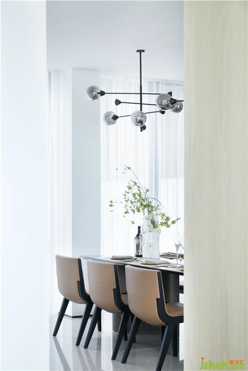 就餐區(qū)的樣板房設(shè)計(jì)以簡(jiǎn)雅為意。淺色皮質(zhì)餐椅與大理石相得益彰,精致的酒杯圓盤等器物在清新綠葉的映襯下抒寫四季三餐的溫馨。