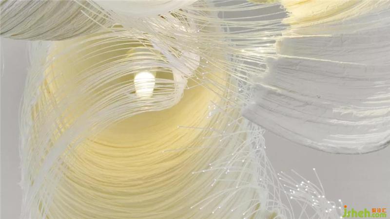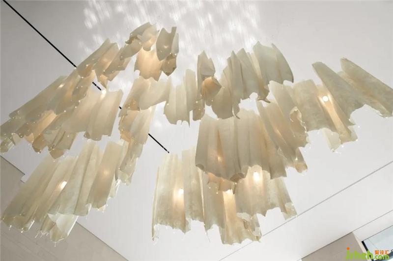 設(shè)計(jì)師巧妙運(yùn)用了紙藝的透光性,穿入3000多根光纖裝裱出層疊形態(tài),微暖光芒與獨(dú)特造型增添了整個(gè)空間的藝術(shù)氣質(zhì)。
