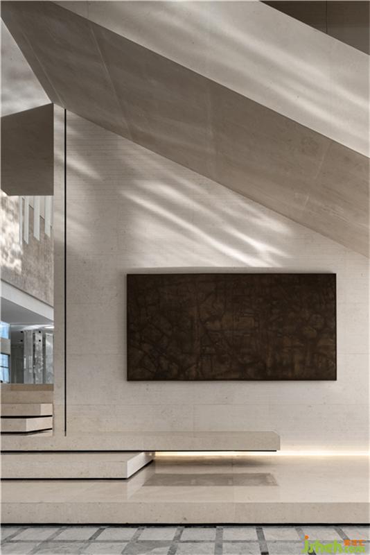 當(dāng)體塊與幾何、線條交疊出造型規(guī)律,樓梯場(chǎng)域不再只是作為功能而使用,更成為藝術(shù)轉(zhuǎn)場(chǎng)、美學(xué)過(guò)渡的一種裝置。與淺米色結(jié)構(gòu)相對(duì)的,是一幅暗色調(diào)的金屬蝕刻掛畫(huà),上面抽象地描繪了天津的地圖,寫(xiě)意一種藏在舊時(shí)光里的秘密沉淀。