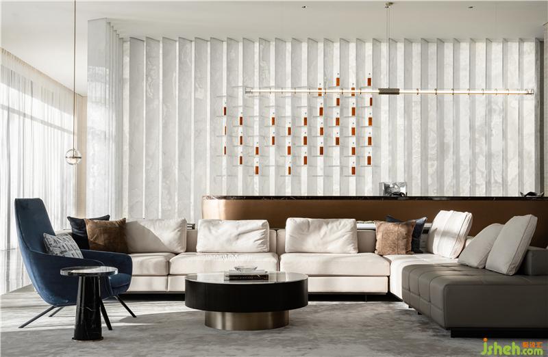 流動(dòng)的光影,真實(shí)存在但又不可觸碰,在時(shí)間性與空間性的交織下,連綿形成獨(dú)特的場(chǎng)景影像。天津銷(xiāo)售中心設(shè)計(jì)師對(duì)光影的駕馭,以藝術(shù)化的視覺(jué)呈現(xiàn),為其注入內(nèi)核力量,讓其變得可體驗(yàn)、可感知,與空間場(chǎng)景融合在一起。自然的木元素與啞光面的天然米色石材格調(diào)互融,點(diǎn)綴以書(shū)的陣列架,呈現(xiàn)出一個(gè)柔和而溫暖的品質(zhì)空間。