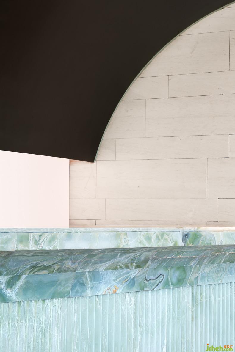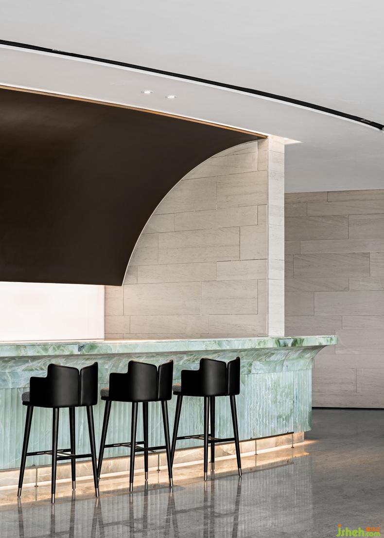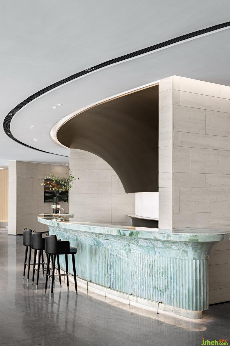 為了提升觀海的體驗,售樓處設(shè)計師在靠近連續(xù)落地窗的二層上空,開設(shè)了窄窄的條狀天窗。兩層通高的“花園式長廊”邀請自由的自然陽光,如鋼琴鍵般在冷暖相宜的理石墻面和地面上彈奏。室內(nèi)設(shè)計師帶有復古情調(diào)的海邊“空中清吧”詩意盎然,精致的金屬吧臺曲面背景與流線型前臺相呼應(yīng),也與華麗的奢侈品級青色玉石共同形成“享受時光流逝”的氛圍。