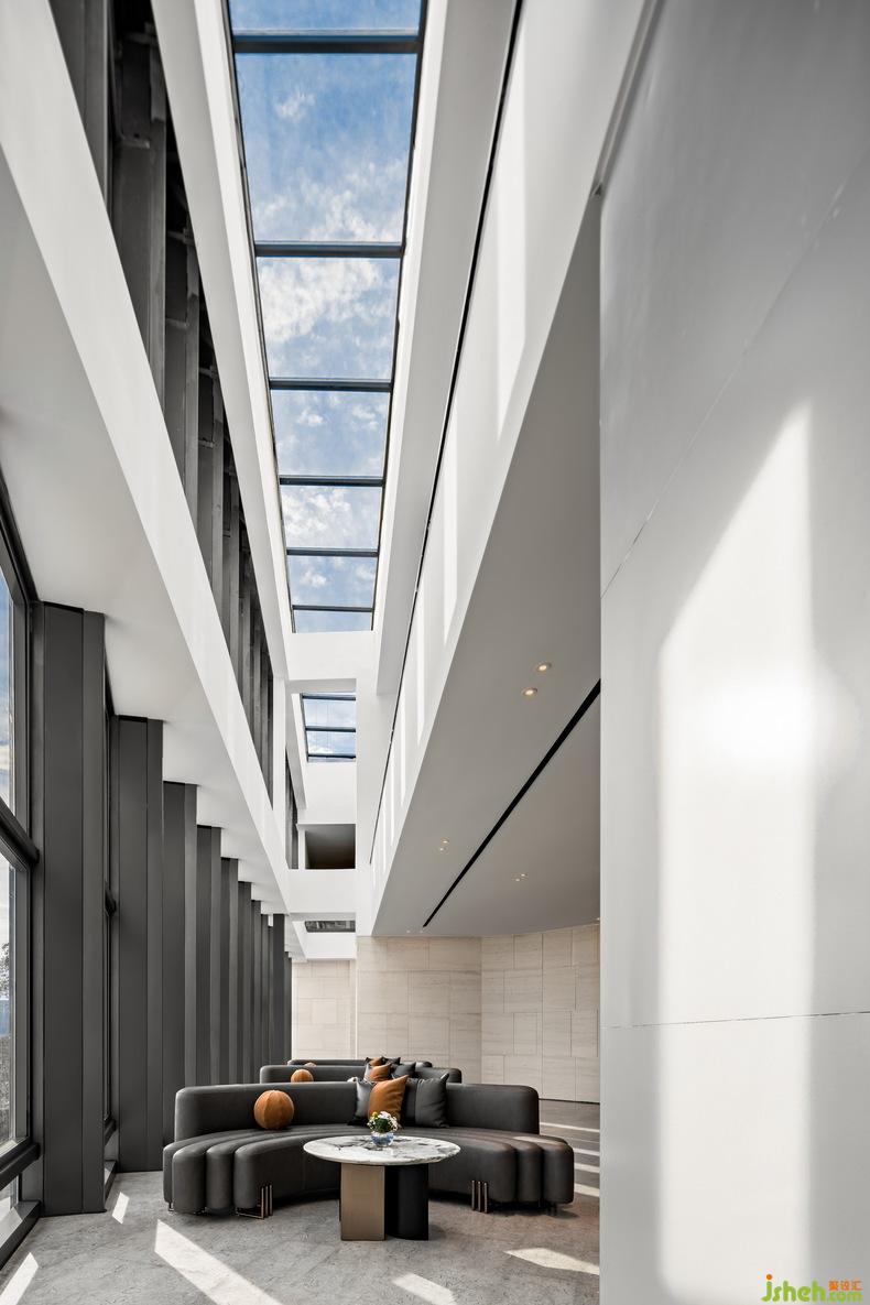 “島嶼客廳”的誕生也是如此:售樓處設(shè)計通過打通三層樓板和屋頂圓形天窗,超過14米高的核心空間——天光中庭應(yīng)運而生。