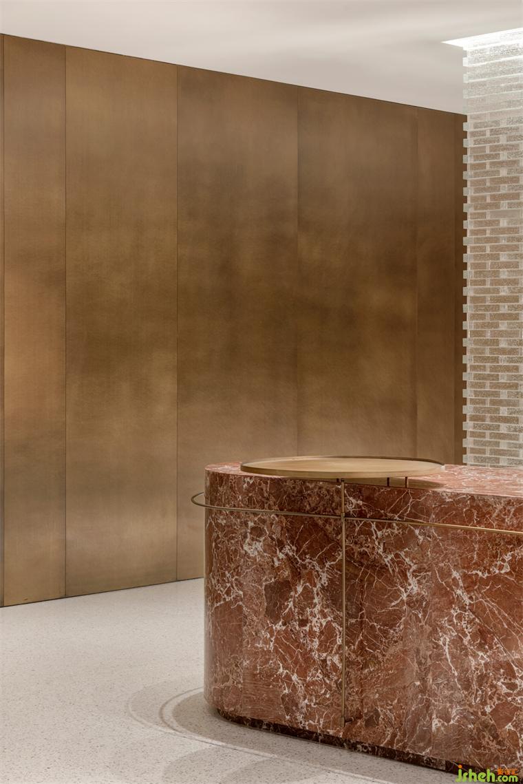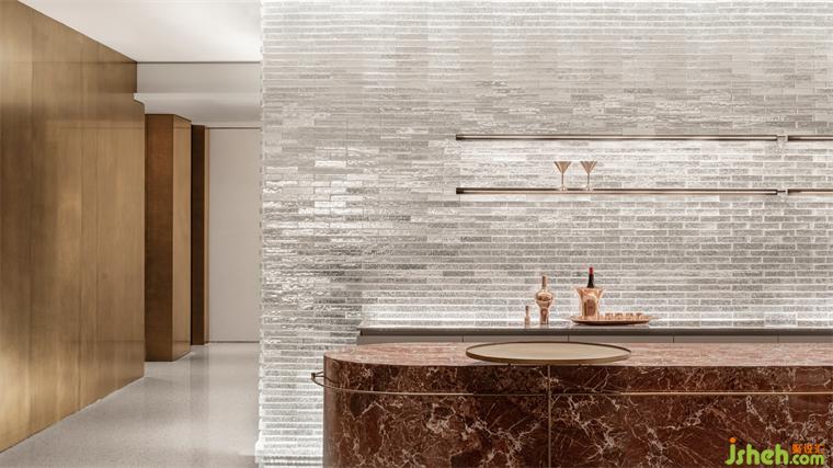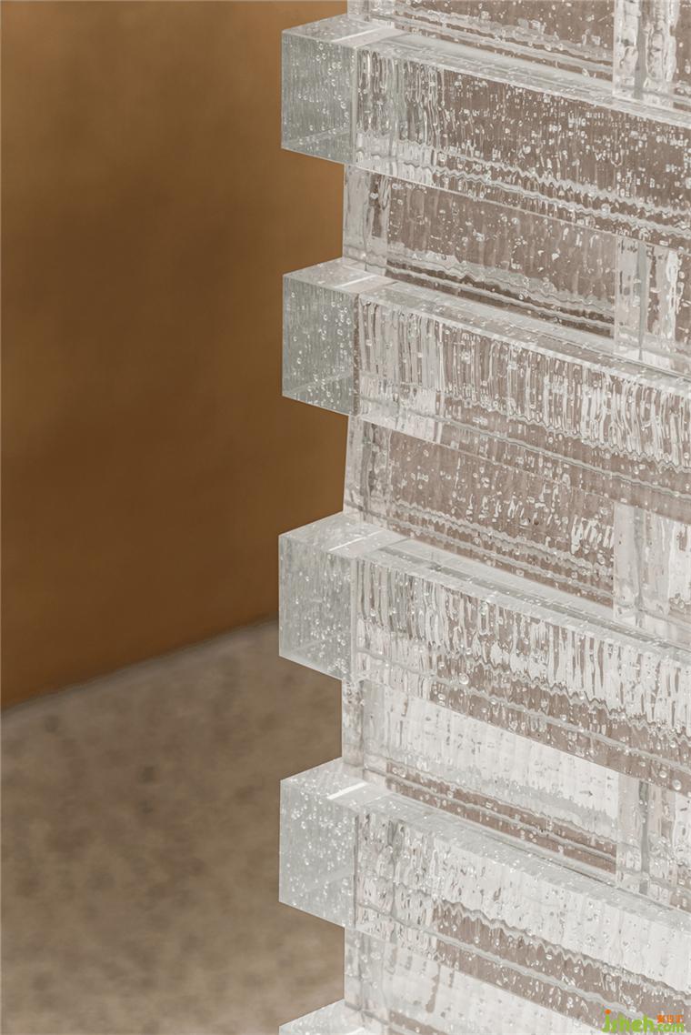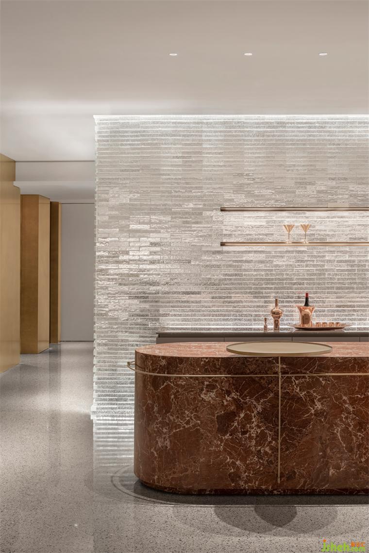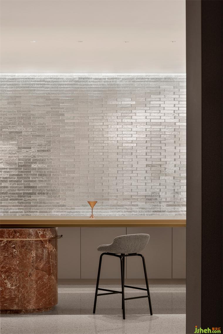 為了突破全室內(nèi)的封閉感,入口迎賓及吧臺(tái)背景墻利用玻璃磚層疊排布形成光的棱鏡效果,裝修設(shè)計(jì)若隱若現(xiàn)的剪影透射而出,隱而不盲、藏而不喧。