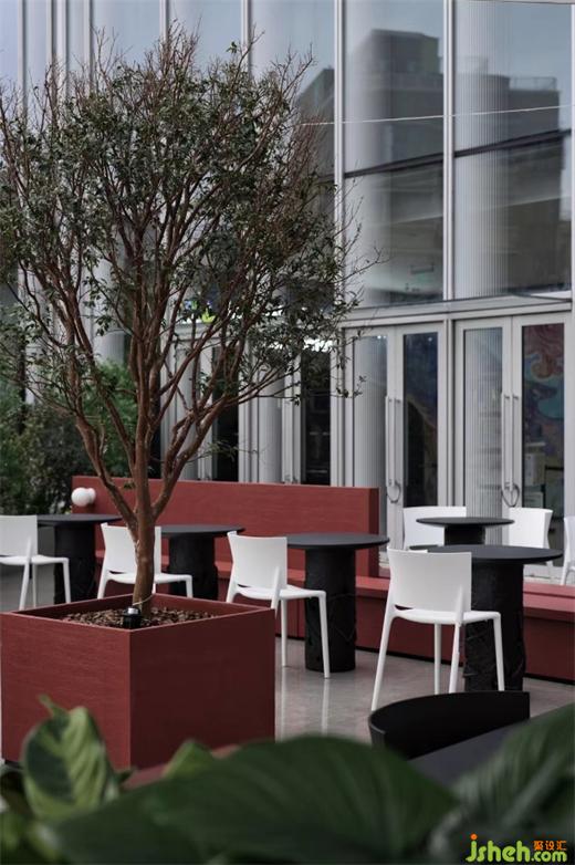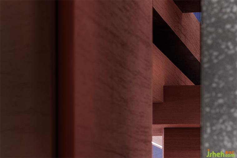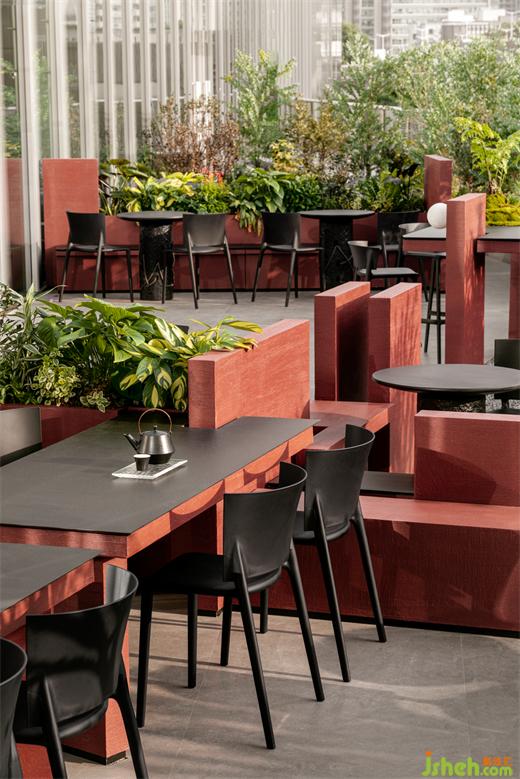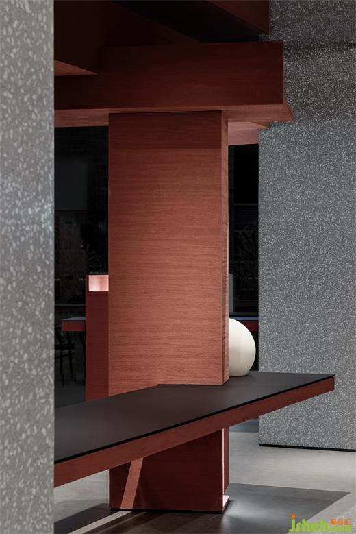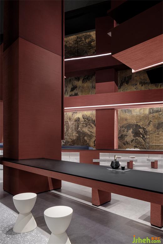 風(fēng)化紅壤土斑駁的紋理充滿歲月古老的粗糙感,從觸感、觀感都完美復(fù)刻了土壤的風(fēng)化斷層面。茶樓設(shè)計(jì)火山黑巖板與之形成意象色彩沖突,重現(xiàn)著古老的自然演化過程。