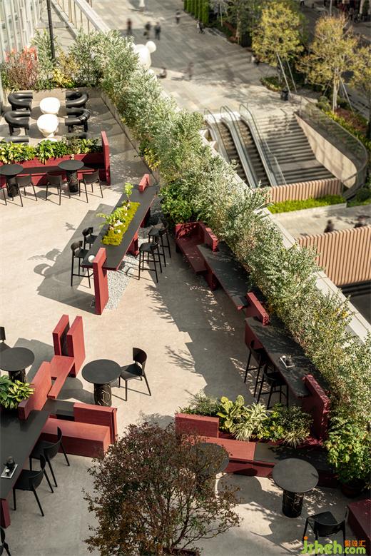 榫卯模塊圍合的三角場(chǎng)地與室內(nèi)架構(gòu)貫通。這里的造型低矮且靈活,茶樓設(shè)計(jì)落座的同時(shí)又具墻體的隔斷功能。
