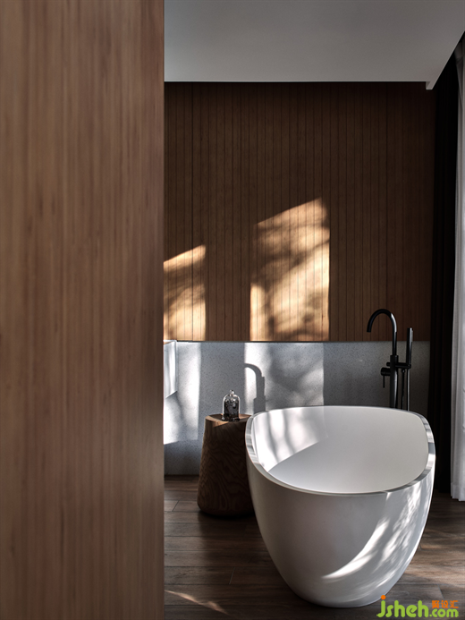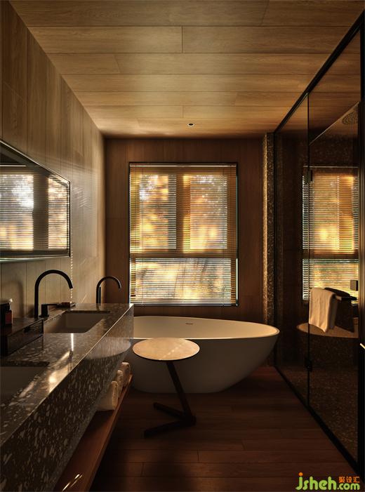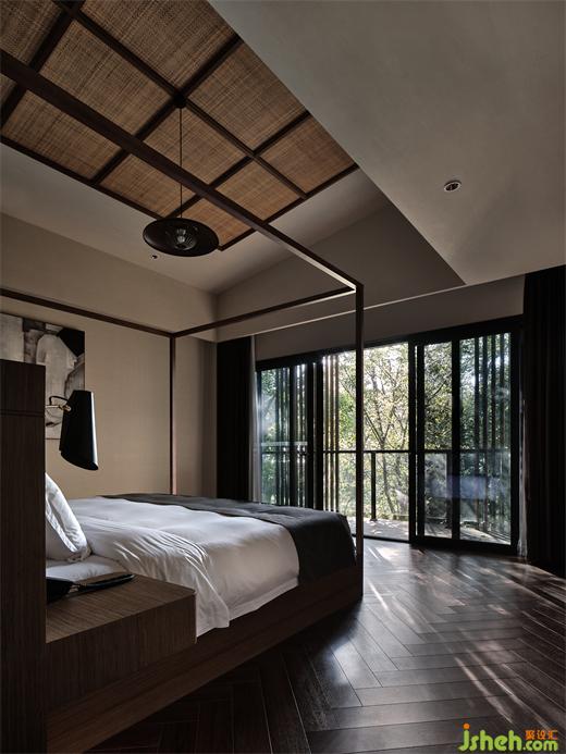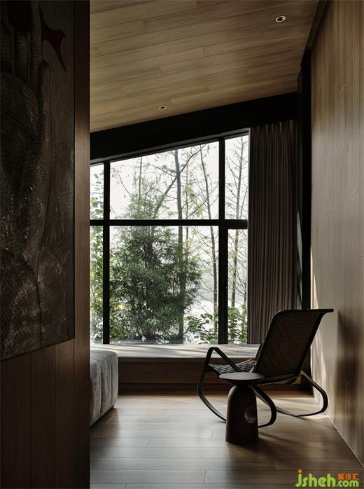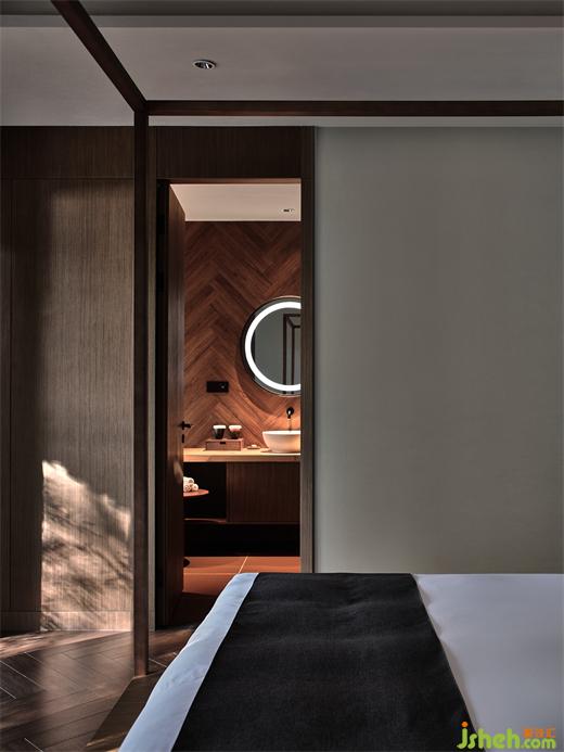 在莊園酒店設(shè)計師看來,建筑物與環(huán)境的和諧,從對在地性的思辨、挖掘與運用開始,這也是回歸自然的第一步。竹林雅居單臥院落以榻榻米的構(gòu)造,形成了日式風(fēng)格的旅居小屋,竹木貫穿于天地墻的造型中。一線天窗打開空間的自然視野,設(shè)計師在空間內(nèi)置入原木色的盒子體塊,再造層次感,與斑駁樹影相映成趣。
