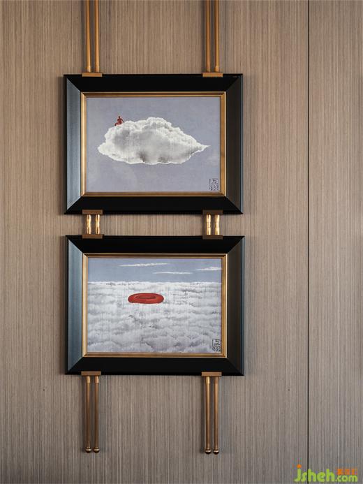 進(jìn)入玄關(guān),映入眼簾的一組藝術(shù)裝置,營造了一種明月出天山,樣板房設(shè)計(jì)蒼茫云海間的詩意場景和儀式感。