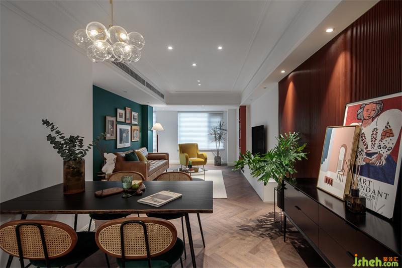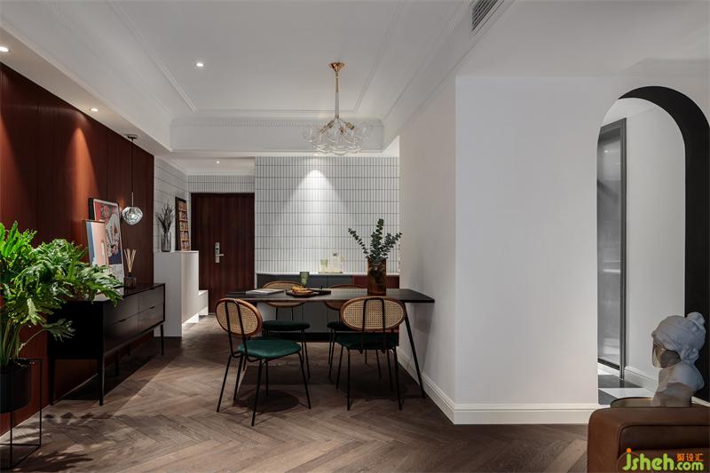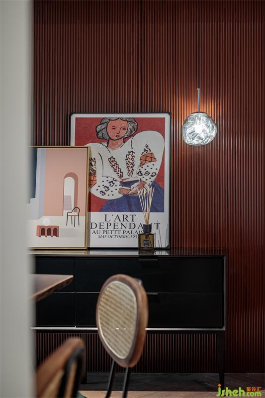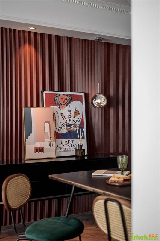 推門入眼,是耀眼的磚紅色,熱烈而朝氣蓬勃。墻面的紅色波浪板在能夠增加空間層次的同時,也起到一定的過度作用,搭配墨綠色的竹編餐椅,在人字拼木地板的映襯下,復(fù)古而摩登。