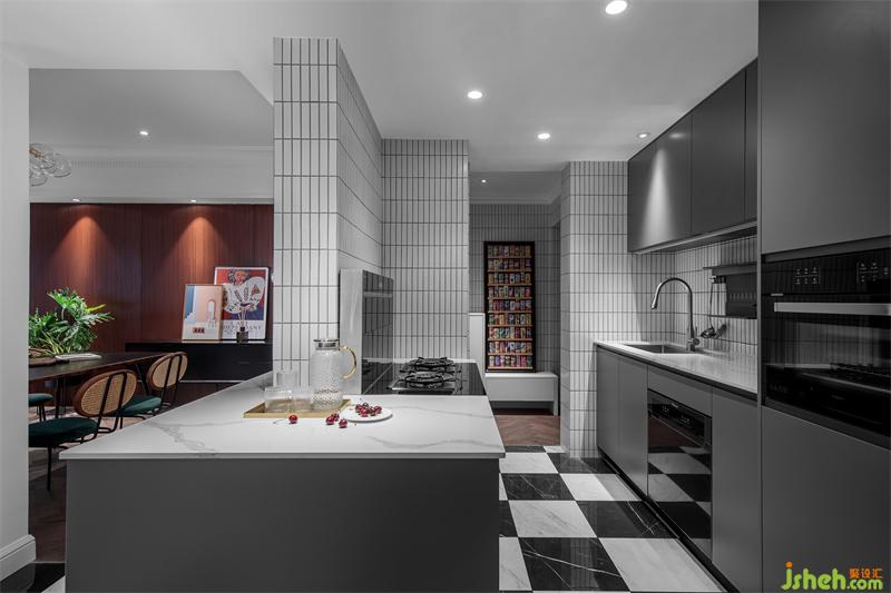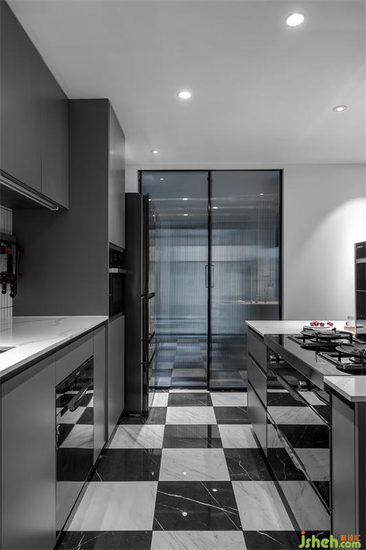 原廚房因為空間獨立且形式單一,而導(dǎo)致空間具有局限性,設(shè)計師在考慮這些因素后決定打破常規(guī)。將廚房與生活陽臺之間墻面拆除,以極簡的玻璃隔斷一分為二,與餐廳形成一體設(shè)置成開放式廚房,最大程度的滿足廚房的功能需求,也離斷了原有的固定空間,讓整個空間變得自由寬闊,采光充足。黑白格子的瓷磚,增加空間的趣味性。