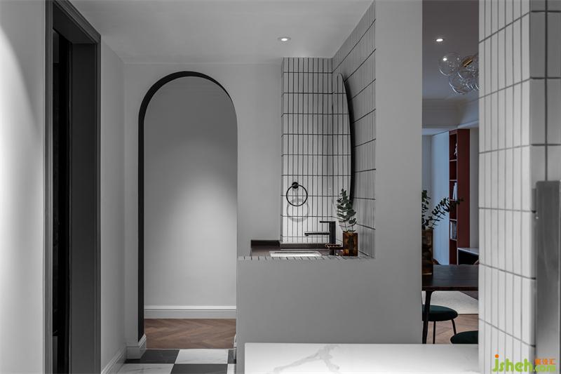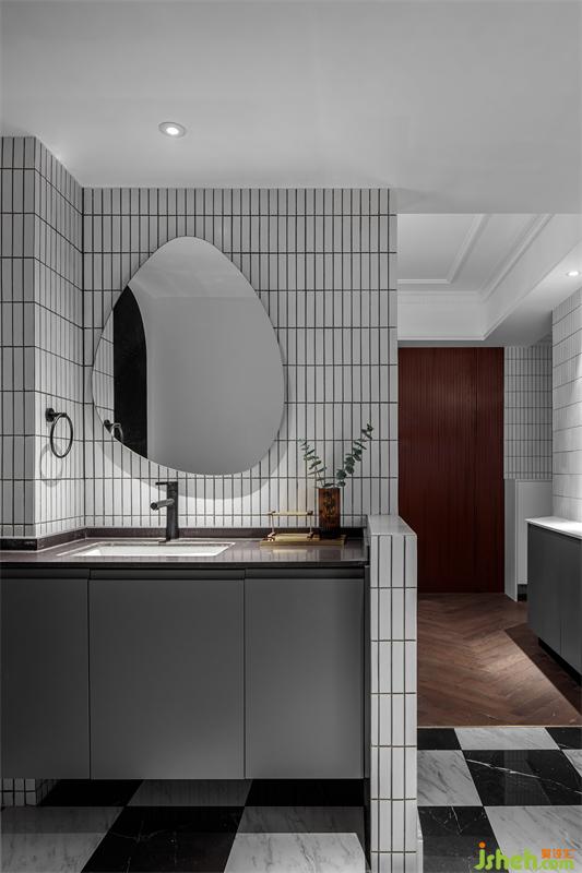單從圖片上看,猶如迷宮一般,小小的空間每一處都是驚喜。在空間的規(guī)劃上犧牲了部分次臥空間,使公共區(qū)域的衛(wèi)生間能夠做到干濕分區(qū),提升使用率。水滴型的鏡子,搭配純白的馬賽克瓷磚,將空間點綴得更加有層次感。