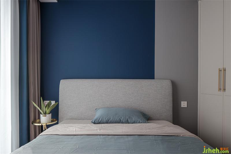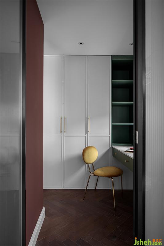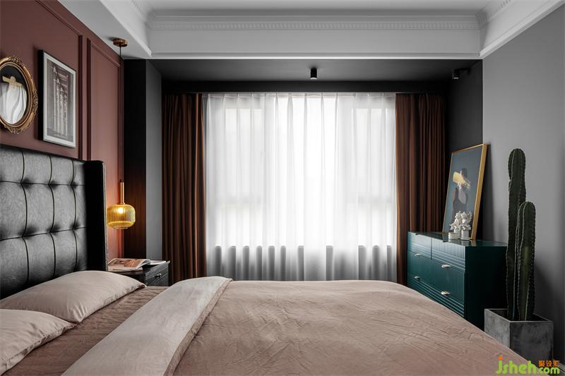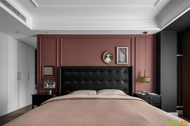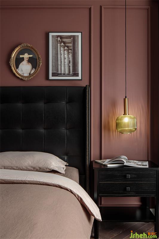 設(shè)計師基于對簡約空間的追求,色彩上,臥室選擇淺一點的豆沙紅與深黑色,局部點綴墨綠色,沿用了客廳一貫的撞色法,生動而有趣。