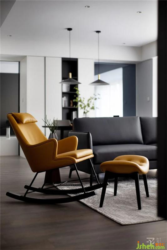 整體空間盡量簡(jiǎn)單、干凈、質(zhì)感、舒適,簡(jiǎn)單柔軟的深灰色皮沙發(fā)和姜黃色的單人位沙發(fā),讓活動(dòng)空間自由而純粹。沒(méi)有過(guò)多的造型和復(fù)雜的裝飾,嵌入式的電視鑲嵌在背景墻中,連所有的電源線都被完美的收納在其中,看不到一絲雜亂。