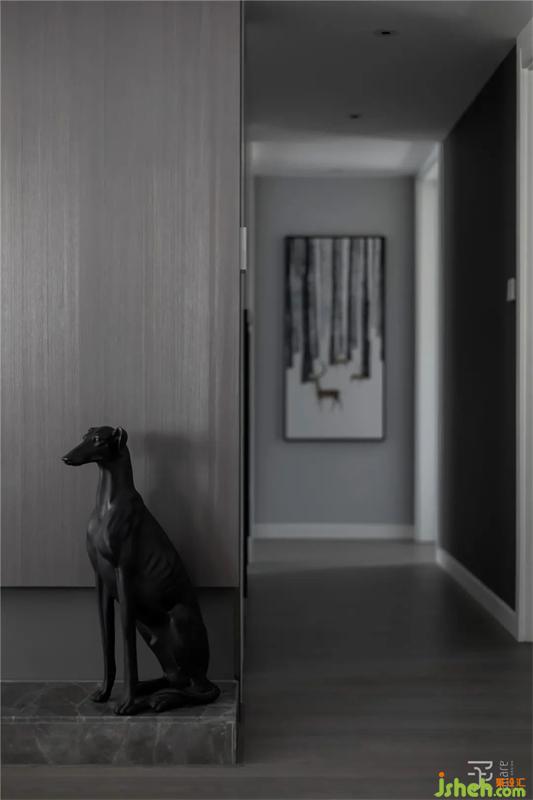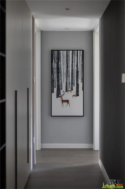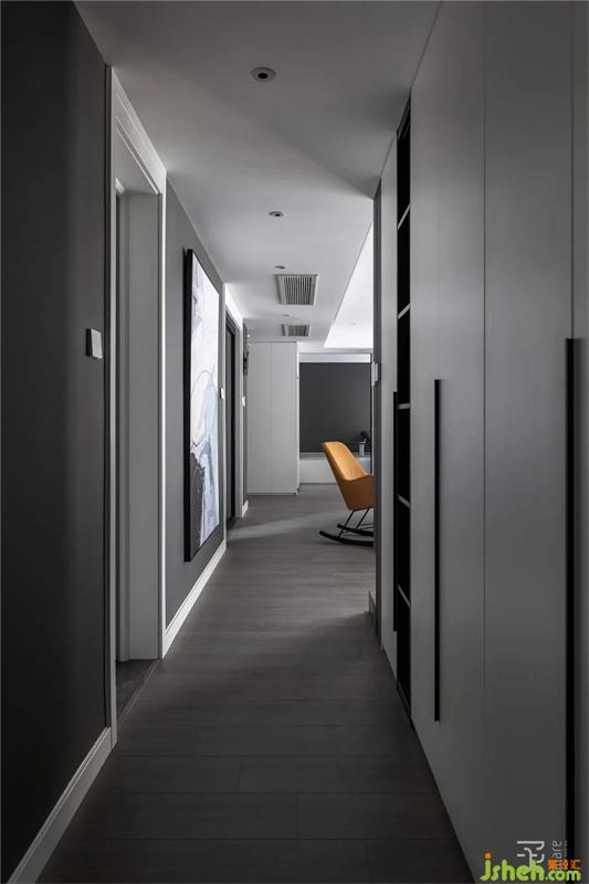 過(guò)道空間的墻面空間做成與衣帽間相鄰的雙面柜,一面為衣帽架的衣柜,一面為雜物柜兼部分展示柜功能。