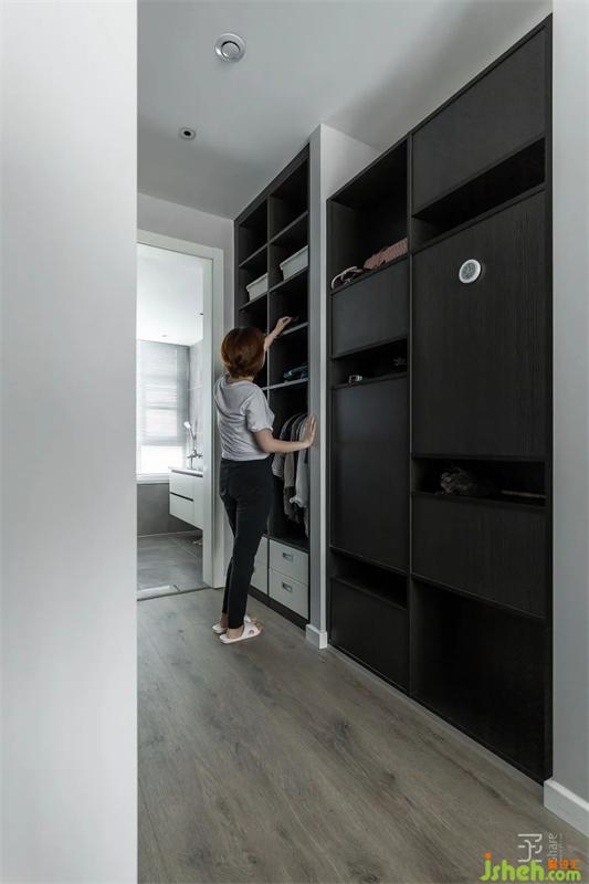 原本從主臥進(jìn)衛(wèi)生間的空間通道尺寸很小,而且衣帽間也很小,不方便使用。通過(guò)對(duì)墻體的拆除,將衣帽間的空間打開,在進(jìn)門處設(shè)置玄關(guān)柜,把衣帽間與衛(wèi)生間結(jié)合在一起,讓空間動(dòng)線更為方便,同時(shí)空間也更加開闊。