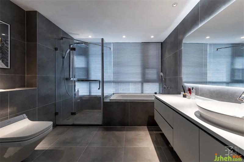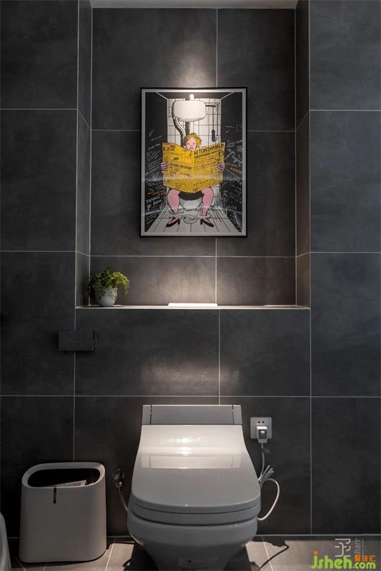 配合整體的格調(diào),衛(wèi)生間選用深灰色的瓷磚,搭配白色臺(tái)盆柜讓空間舒爽干凈。用最簡(jiǎn)單的細(xì)邊框磨砂隔斷分割出若隱若現(xiàn)的私密空間。馬桶背后的個(gè)性掛畫,戲虐中又帶著一些輕松感。