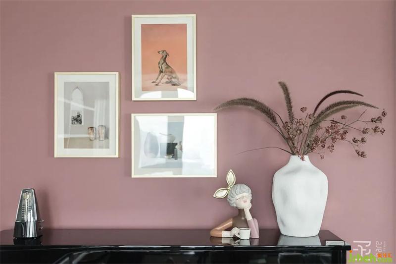 淡淡的粉色與女兒房相互響應(yīng),優(yōu)雅的鋼琴搭配質(zhì)感的花瓶擺件,在金色邊框的裝飾畫的映襯下格外美好,隱藏的玻璃推拉門使得琴聲悠揚(yáng)的充滿整個(gè)空間。