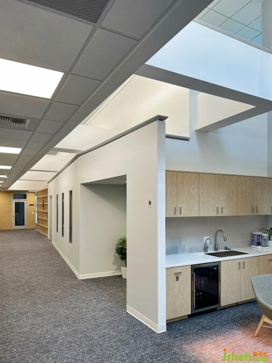 The pantry is located at the corner of the corridor, with a double-height design that ensures ample natural light penetration, creating a warm and bright hub for socializing and relaxation. In this gray-and-white-toned space, the pantry injects a touch of vitality into the serene environment. A gradient red carpet in the central area adds energy, complementing the light wood-toned bar counter to bring warmth and vibrancy to the space. The thoughtful combination of colors and materials strikes a balance between the tranquility of the office and the casual, cheerful ambiance of the pantry, making the entire area harmonious yet rhythmically dynamic.