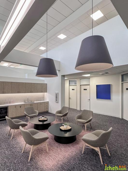 茶水間位于走廊轉(zhuǎn)角處,其挑空設(shè)計(jì)確保了自然光的充分滲透,形成了一個(gè)溫馨明亮的社交與休閑中心。在這個(gè)以灰白為基調(diào)的空間中,茶水間的設(shè)計(jì)為寧?kù)o的環(huán)境注入了一抹活力。中央?yún)^(qū)域鋪設(shè)的漸變紅色地毯充滿活力,與淺木色的水吧臺(tái)相輔相成,為茶水間帶來(lái)了生機(jī)和溫暖。這些色彩與材料的巧妙搭配,平衡了辦公空間的靜謐與茶水間的輕松愉悅,使整個(gè)區(qū)域既和諧統(tǒng)一又充滿節(jié)奏感。