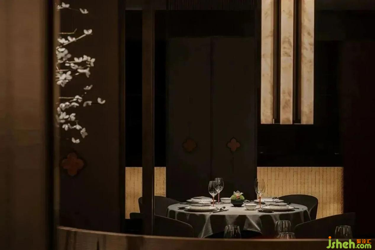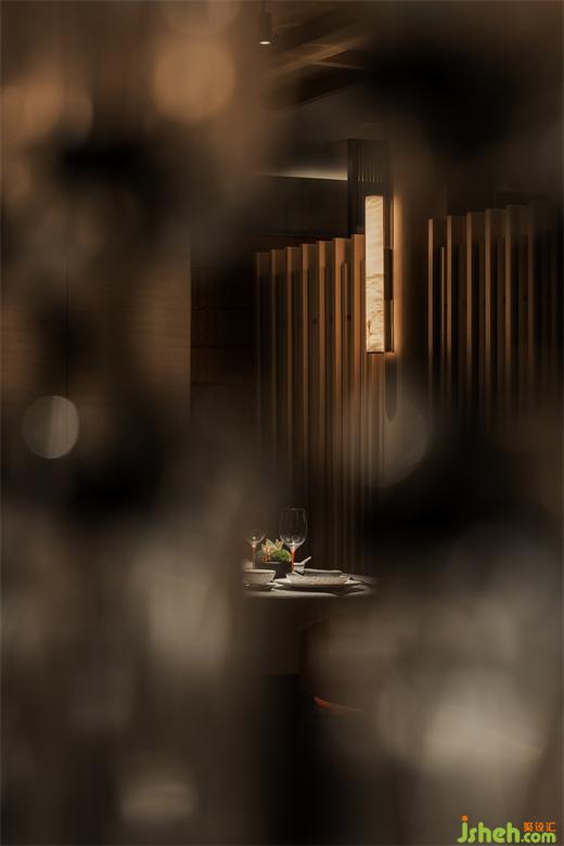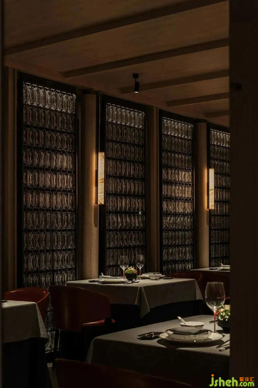移步換景,數(shù)塊透光玻璃屏風(fēng)與沉穩(wěn)的木調(diào)形成對(duì)稱,卡座燈光之間的相互呼應(yīng),給予場(chǎng)域尺度感和溫暖的氛圍。