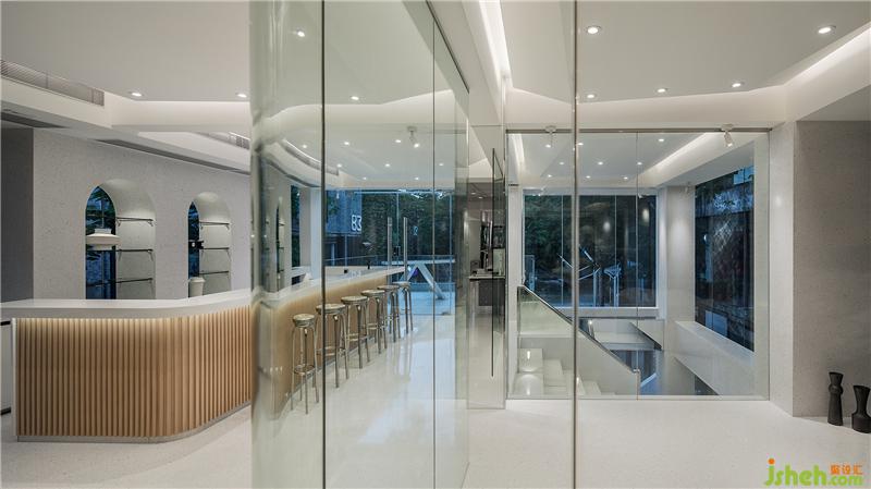 開放式圓栱門包裹不銹鋼,增添潮流感,形成了開放、流暢的空間動(dòng)線。辦公室與櫥窗之間設(shè)置了半開放墻,增強(qiáng)空氣對(duì)流,巧妙化解空間局促。