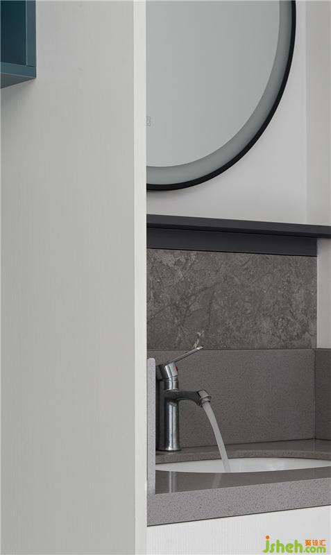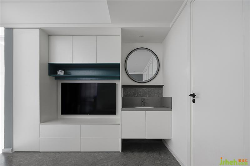 客廳電視墻設(shè)計(jì)柜體與洗漱臺(tái)的結(jié)合,功能疊加,輔助客廳收納的同時(shí),實(shí)現(xiàn)干濕分離。右側(cè)門后是衛(wèi)生間,因?yàn)樵济娣e原因,本身空間局促。室內(nèi)設(shè)計(jì)師通過分析需求和對(duì)空間的重新整合,將洗漱臺(tái)與電視墻作為一個(gè)整體設(shè)計(jì),在解決使用需求的同時(shí),將其融入到客廳的整體氛圍中。