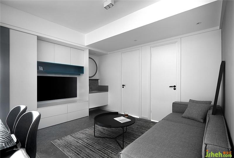 室內(nèi)設(shè)計(jì)師重新布局的客廳能夠恰恰放下三人位沙發(fā),保證客廳功能的完整性。黑色茶幾的加入豐富空間的層次,柜子色調(diào)與空間色調(diào)形成反差,擴(kuò)寬了空間的視覺張力,簡(jiǎn)潔干練的同時(shí)不會(huì)顯得單一。