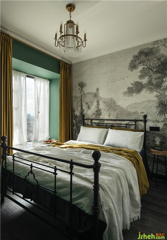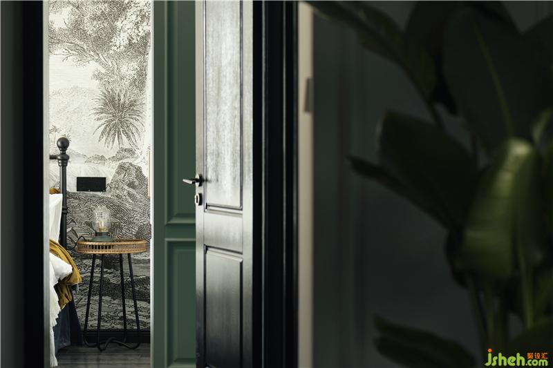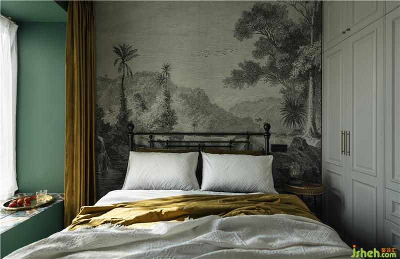 室內(nèi)設(shè)計(jì)師根據(jù)業(yè)主需求,將次臥室作為今后的兒童房,黃色與綠色進(jìn)行強(qiáng)烈對(duì)比與渲染,年輕活力,背景墻面采用黑白裝飾畫壁紙形成反差,于小景中見(jiàn)大景,空間畫面感更強(qiáng)。