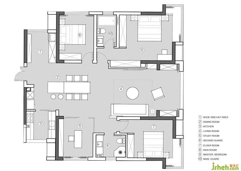3,書房與餐廳、客廳的重新界定,增加互通性,豐富生活場(chǎng)景畫面。