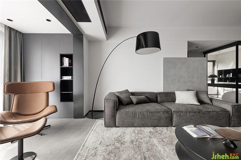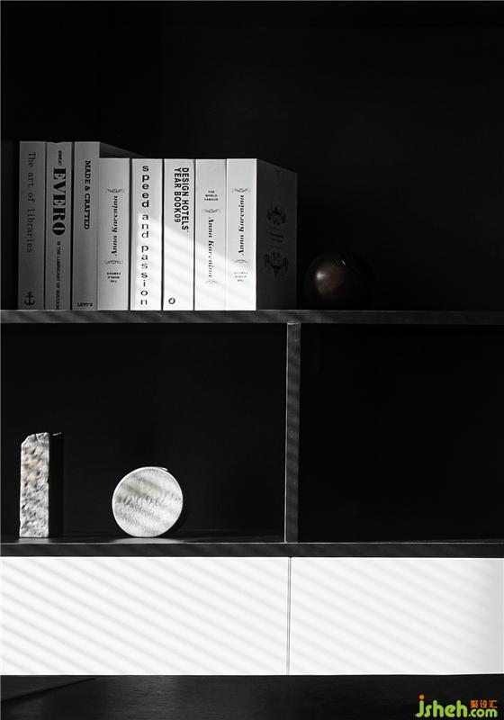 客廳區(qū)域使用單色材質(zhì)的對(duì)比,黑白灰色系的整體搭配方式來進(jìn)行空間氛圍的營(yíng)造,通過木材、水泥漆、石紋墻板和地磚的自然肌理碰撞出不同視覺感受,以不同層次的幾何造型體塊、解構(gòu)、重組、裝置般的處理,創(chuàng)造不一樣的空間立面形態(tài)。