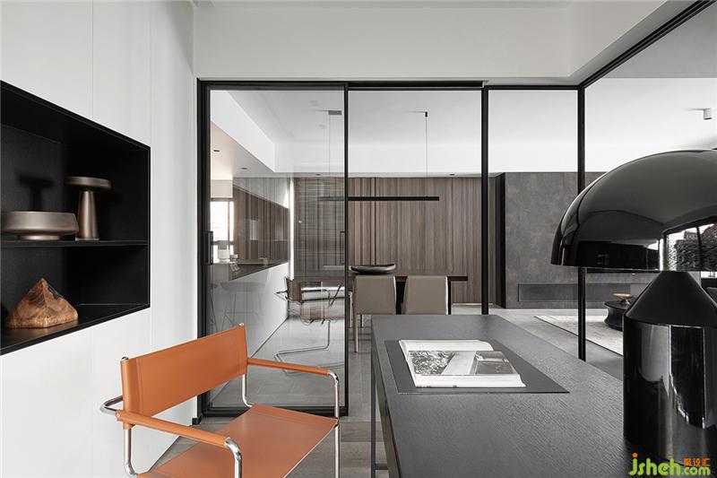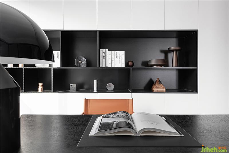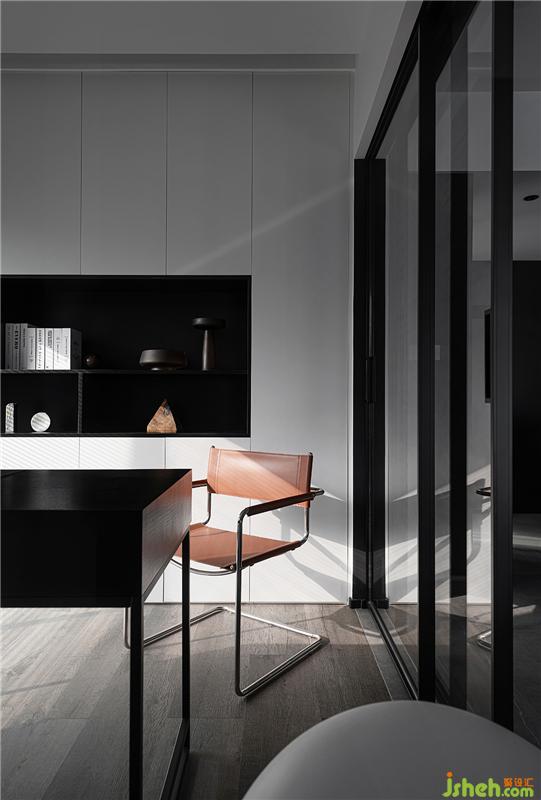 利用玻璃移門圍合書房空間,實(shí)現(xiàn)視覺最大化,收納需求較多,設(shè)計(jì)一整面的收納+局部展示柜,美化實(shí)用功能,保證空間的整潔、完整,半開放的層板設(shè)計(jì)更是增加了空間之間的通透性和藝術(shù)性。