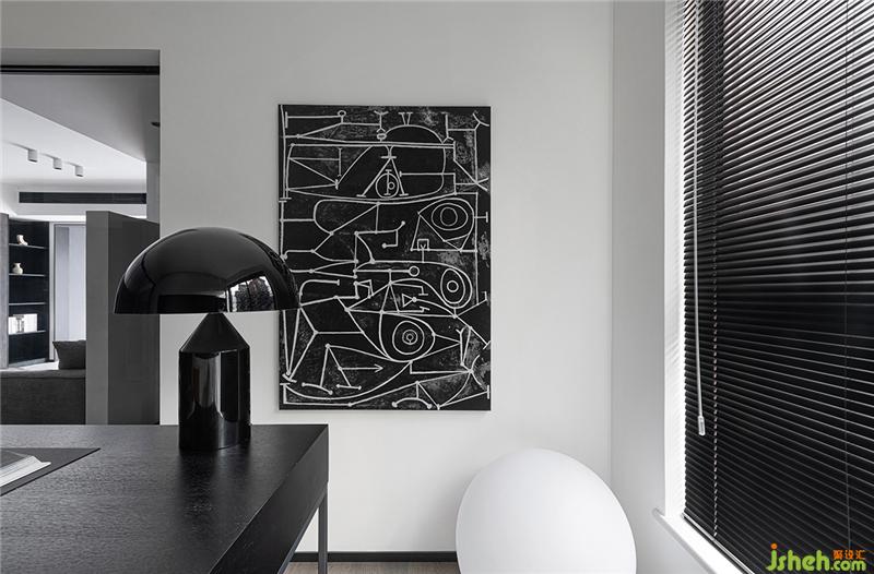 百葉簾的隱約開合、抽象藝術(shù)掛畫的存在以及圓形燈球的交匯相應(yīng),給書房空間注入別樣的氛圍。