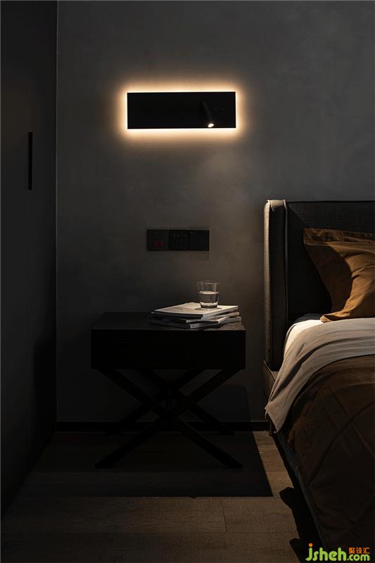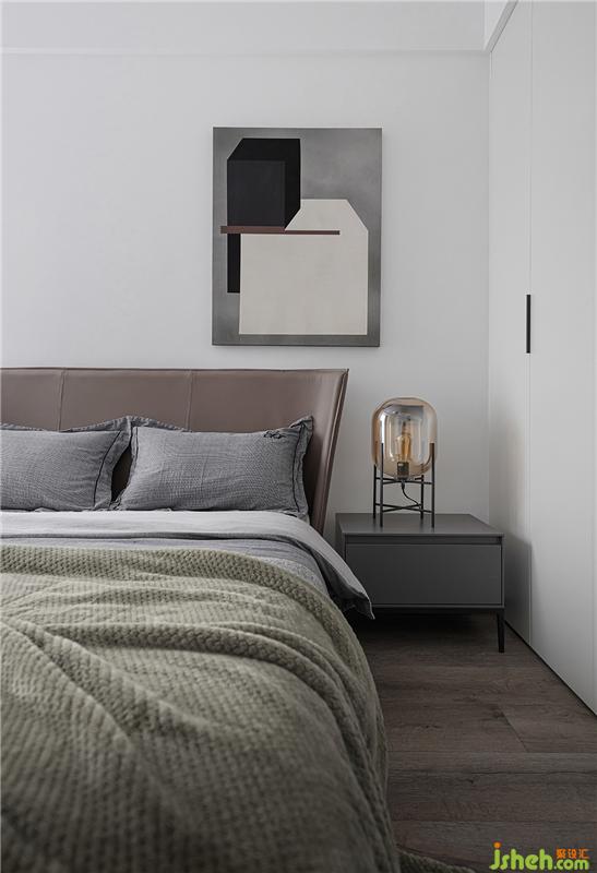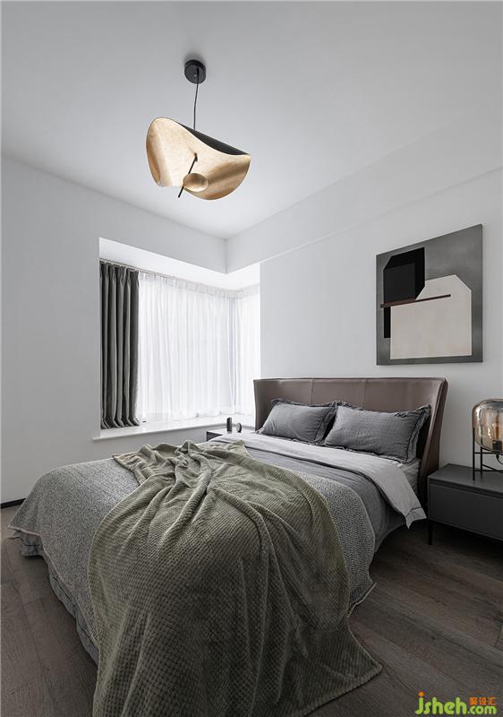 水泥漆、啞光衣柜、亞麻布樣的床頭,不同層次的灰度顏色和自身肌理的呈現(xiàn),加上色彩濃烈的床品,延續(xù)了客廳的設(shè)計(jì)構(gòu)架,避免了空間的色彩單一,同時(shí)也為主臥增加一絲暖意,床頭的壁燈及小型吊燈讓空間多一份情調(diào)。