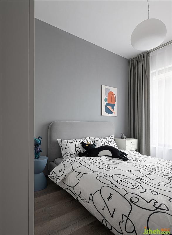 兒童房延續(xù)整體的極簡(jiǎn)主義基調(diào),以床品、掛畫、業(yè)主的喜好物件來(lái)營(yíng)造乖巧輕松的氛圍。