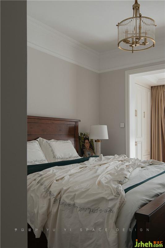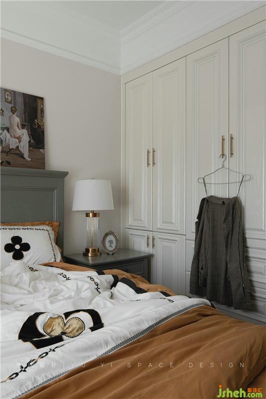 金色質(zhì)感的衣柜把手、金色質(zhì)感元素的臺燈、油畫裝飾畫與棕黃色床品進(jìn)行組合搭配,格外的愜意。掛在柜門前方的衣服也成為了畫面中裝飾的一部分,自然、隨性。