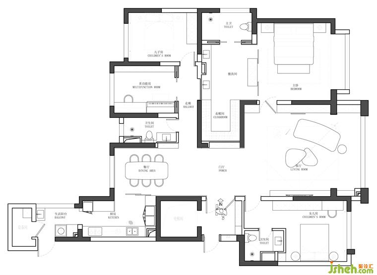 3.擴(kuò)大廚房洞口,使空間比例得到延伸4.衛(wèi)生間的布局調(diào)整,增加收納空間