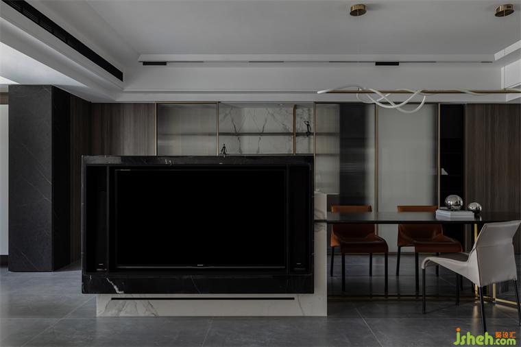 餐桌、島臺與簡易電視墻體塊疊加成整體。別墅裝飾餐邊柜與西櫥柜結(jié)合,設計整面柜,吊滑門可移動于柜子前方任意位置,創(chuàng)造出柜體形式與視覺上的可變、多樣性,實用與美觀達到統(tǒng)一。