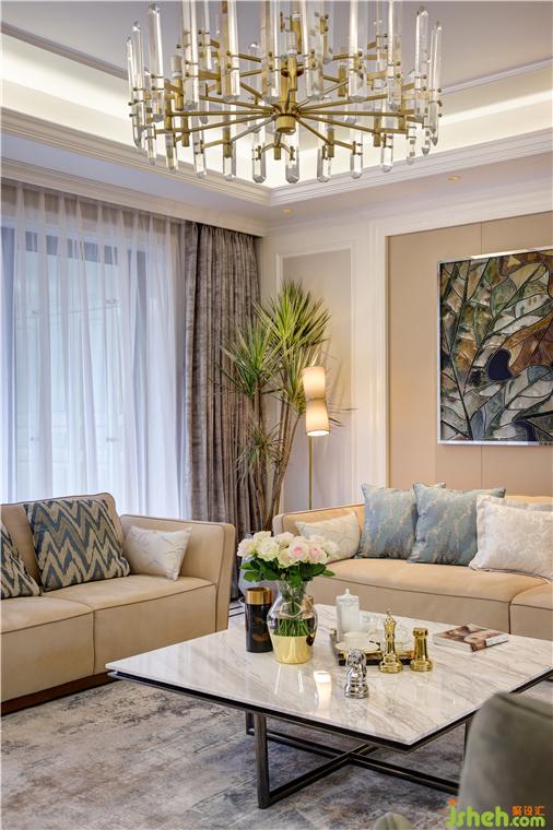 生活可以是柴米油鹽、也可以是一塵不染、灑脫自在的優(yōu)雅模樣。敞亮的客廳與餐廳相連結(jié), 融入優(yōu)雅、低調(diào)奢華的金屬色調(diào),大膽而活躍的搭配,餐廳與客廳相通,設(shè)計(jì)師用卡其色演繹輕奢之美,讓人們?cè)趦?yōu)雅的用餐時(shí)光里重溫歐式貴族情調(diào)。主人不凡的品位在空間中娓娓道來(lái)。精致的家具營(yíng)造生活的格調(diào)。精心挑選的每樣家居飾品,體現(xiàn)了主人不凡的生活品味。沒(méi)有太多的家具裝飾,掛畫和燈具的光影營(yíng)造了空間的浪漫與溫馨。細(xì)節(jié)中盡顯匠心美意。“輕”是一種優(yōu)雅態(tài)度,打造低調(diào)、舒適,卻無(wú)損高貴與雅致的生活?!吧荨笔且环N小資情調(diào)、追求品質(zhì)、精致、卻不失平淡與樸素的狀態(tài)。客廳室內(nèi)設(shè)計(jì)