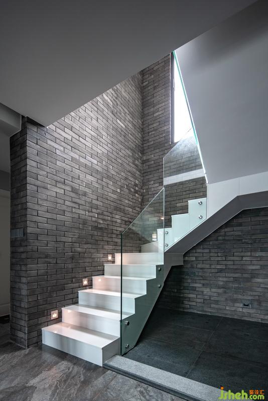 樓梯采用客家天井的開放格局,并在材料上選取中式青磚片和存白色大理石樓梯做個強烈的對比。