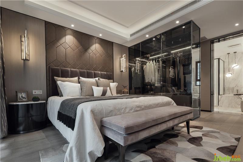 主臥以灰駝色為主調(diào),同色調(diào)軟硬裝營造溫暖沉實(shí)的氛圍。通透茶玻衣柜靈動了整個空間,流露出淡淡簡致奢華之氣。