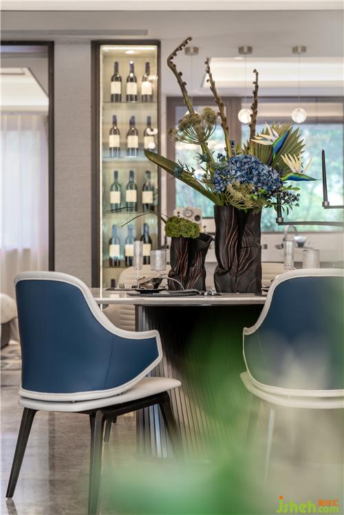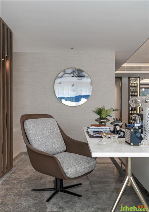 沙發(fā)背后的工作空間為女主人保留了一個(gè)可供創(chuàng)作的小天地,別墅設(shè)計(jì)現(xiàn)代與雅致借由器物的形與色婉轉(zhuǎn)滲入空間之中;同時(shí)達(dá)到了獨(dú)立辦公的又增加家庭交互關(guān)系。
